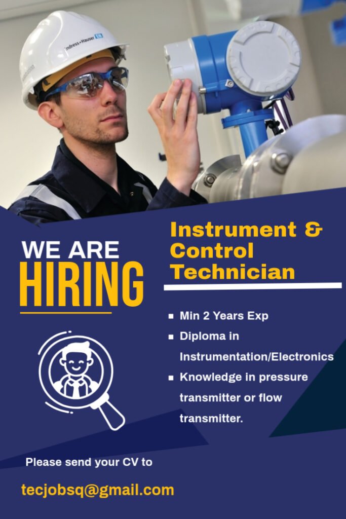 Aug 25, 2025 . Instrument & Control technician Job Category: Instrument & Control technician Job Type: Contract Job Location: Doha Duration: 3 Years Experience: 2 + years Apply for this position Full Name *Email *Phone *Cover Letter *Upload CV/Resume *Allowed Type(s): .pdf, .doc, .docxBy using this form you agree with the storage and handling of your data by this website. *